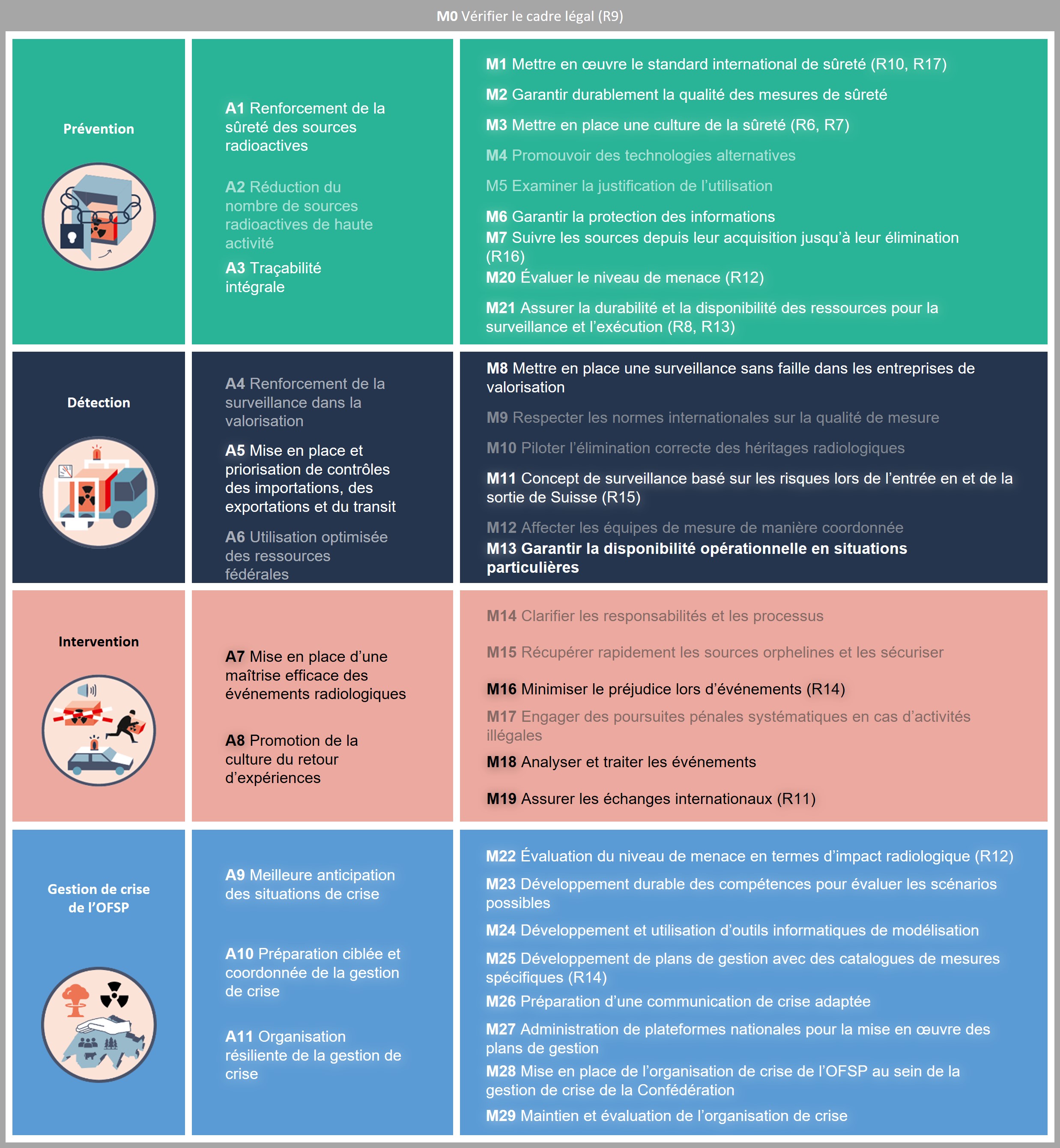Concrètement, il s'agit d'empêcher aussi bien l'utilisation abusive de matières radioactives à des fins criminelles que leur diffusion incontrôlée à la suite d’une élimination non autorisée ou d’une importation, d’une exportation ou d’un transit illégaux. Des groupes de travail composés de membres de plusieurs services fédéraux (OFAC, Laboratoire de Spiez, SRC, Forensique nucléaire suisse, fedpol, MPC, CENAL, IFSN, OFEN, DDPS NBC-DEMUNEX, DFAE, PSI et Suva) issus de six départements ont été constitués autour des trois champs d'action « Prévention », « Détection » et « Intervention ». Les champs d'action ont été divisés en huit axes et dix-neuf mesures.