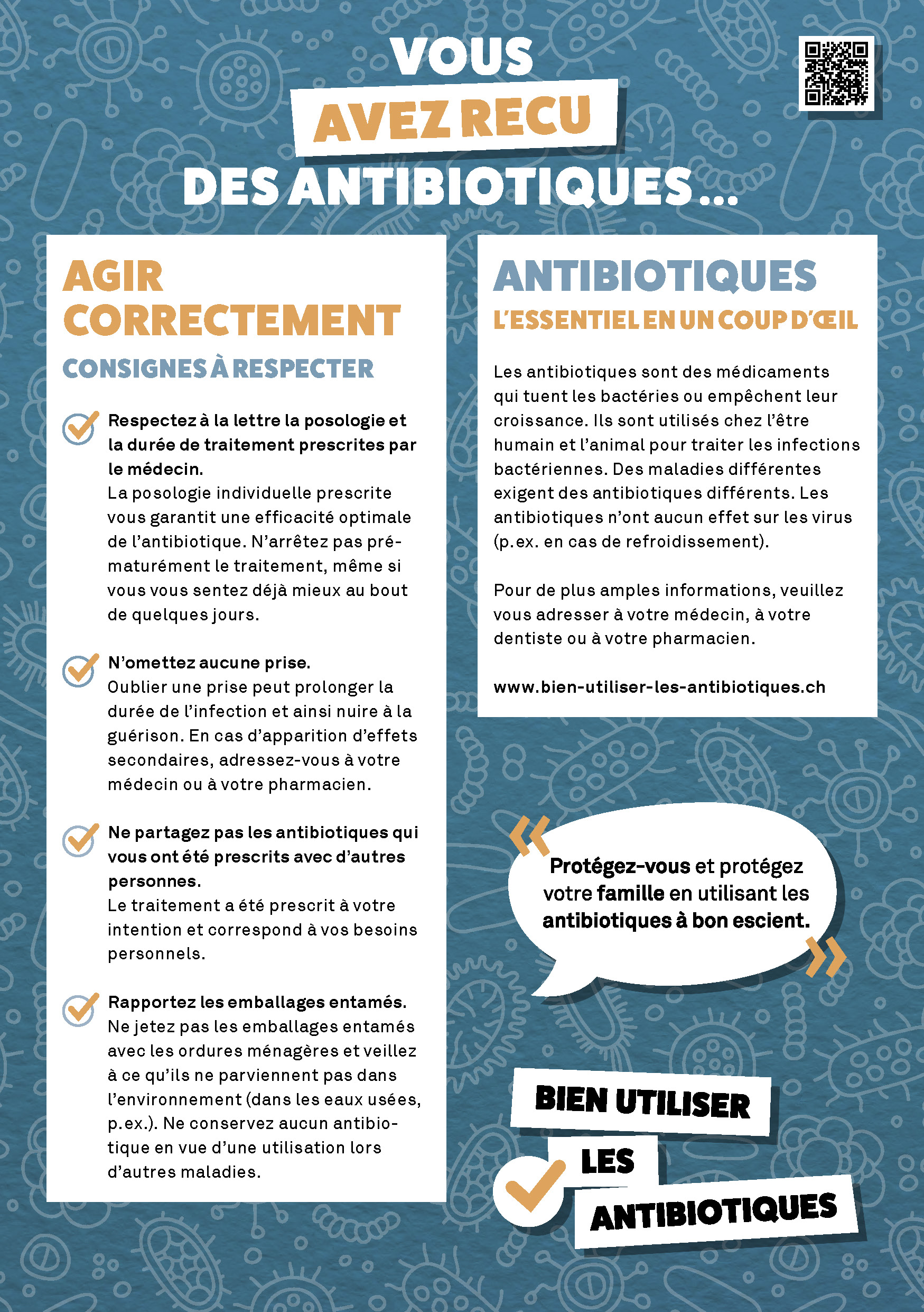 La fiche contient aussi des informations générales sur les anti-biotiques et l’antibiorésistance. Disponible en treize langues, elle peut être utilisée dans le cadre d’une consultation. La fiche d’information et les produits connexes (film didactique, poster, post-it) sont disponibles gratuitement sur le site bien-utiliser-les-antibiotiques.