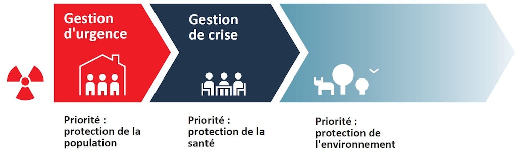 Une urgence radiologique peut être divisée en différents scénarios et en plusieurs phases successives. Au cours de ces phases, différentes mesures de protection sont nécessaires afin de minimiser les conséquences de l'urgence pour la population et l'environnement.