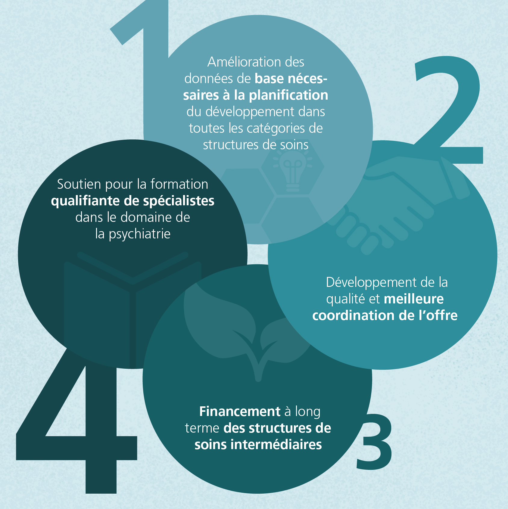 La Suisse dispose en principe de soins psychiatriques de qualité. Néanmoins, certains éléments restent à développer. Afin d’améliorer durablement l’offre, la Confédération met en œuvre des mesures dans quatre champs d’action.