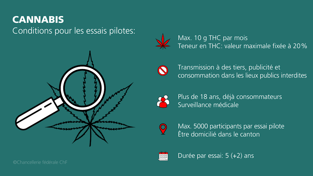 L’OFSP peut autoriser des essais pilotes scientifiques de remise contrôlée de cannabis à des fins non médicales, s’ils sont limités dans l’espace, dans le temps et dans leur objet, et permettent d’acquérir de nouvelles connaissances en lien avec l’utilisation de cannabis.