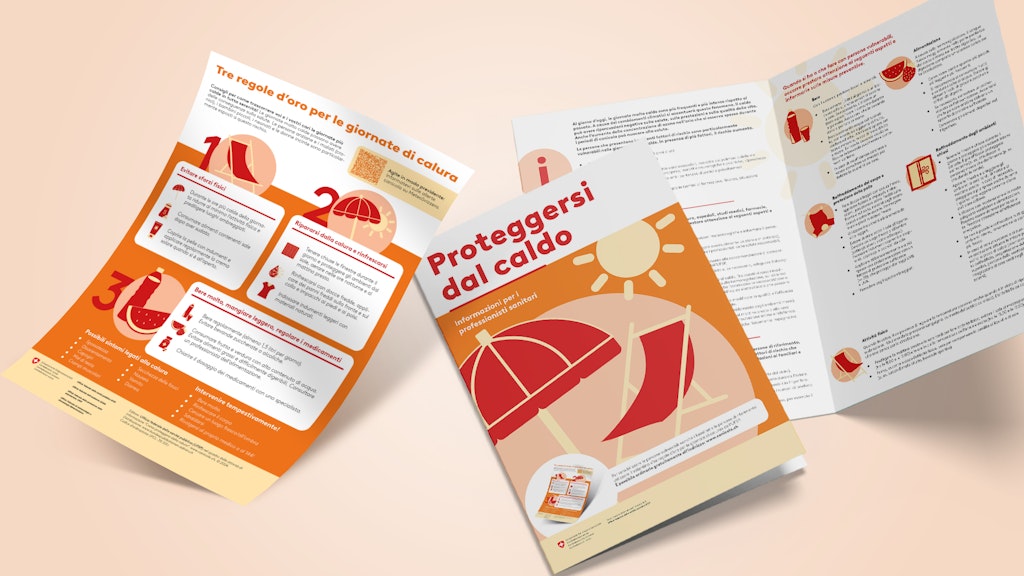 Il volantino contiene raccomandazioni di comportamento in caso di calura e spiega come intervenire tempestivamente in caso di stress da calore. Il volantino (d/f/i/e) può essere scaricato in formato A4 e formato A3 dal sito web dell’UFSP oppure ordinato in formato cartaceo dal sito della Confederazione.