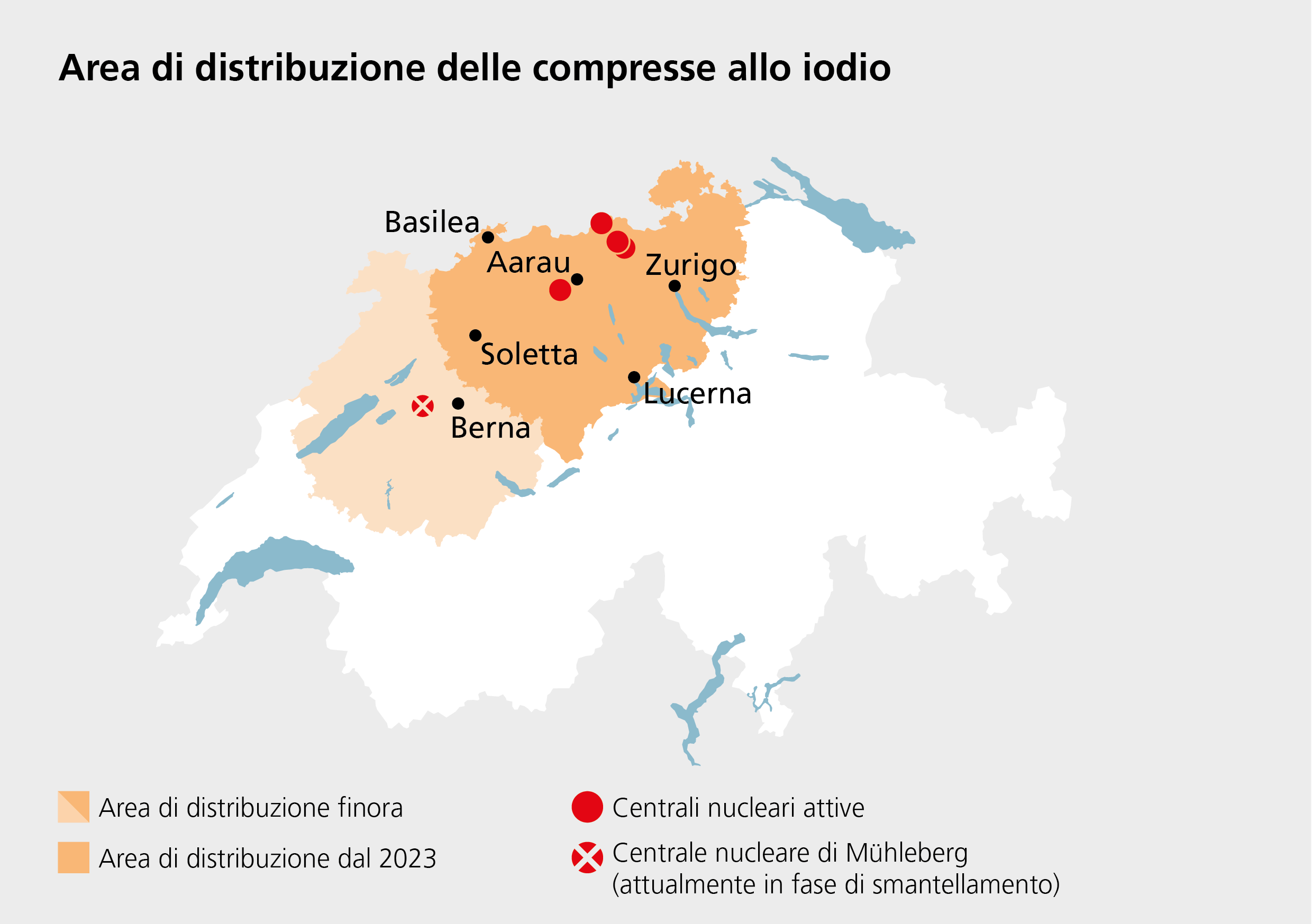 Le compresse allo iodio sono distribuite ogni dieci anni alle economie domestiche e alle aziende svizzere (comprese le scuole, le scuole dell’infanzia e gli asili nido) che si trovano in un raggio di 50 km da una centrale nucleare svizzera. Nelle regioni al di fuori di tale area i Cantoni provvedono a stoccare una quantità sufficiente di compresse allo iodio in modo da consentire l’approvvigionamento della popolazione in caso di evento (si veda «Distribuzione oltre un raggio di 50 km da una centrale nucleare svizzera» più in basso). Si tratta di una misura preventiva di protezione nell’eventualità di un grave incidente in una centrale nucleare in Svizzera o in un Paese vicino.