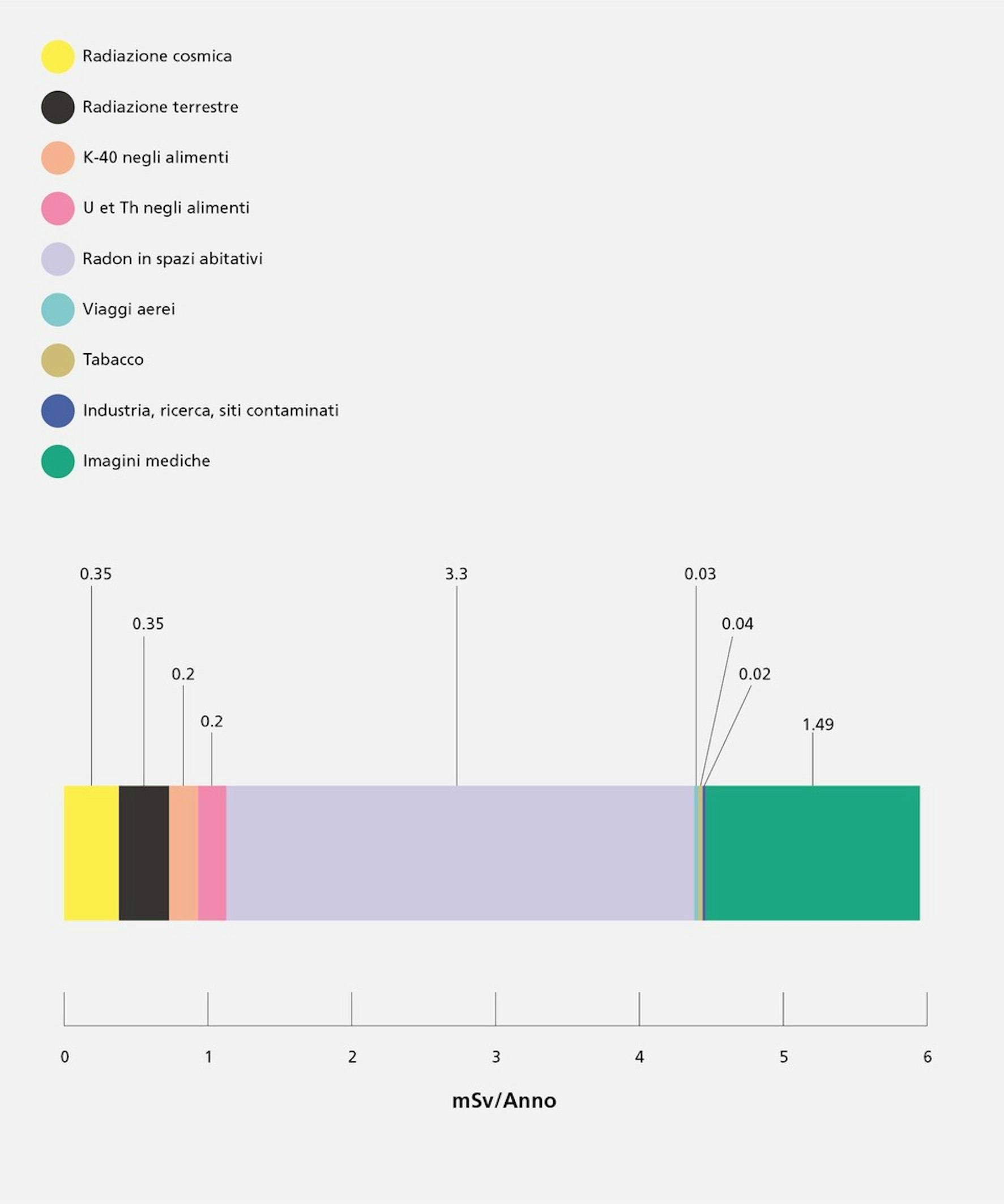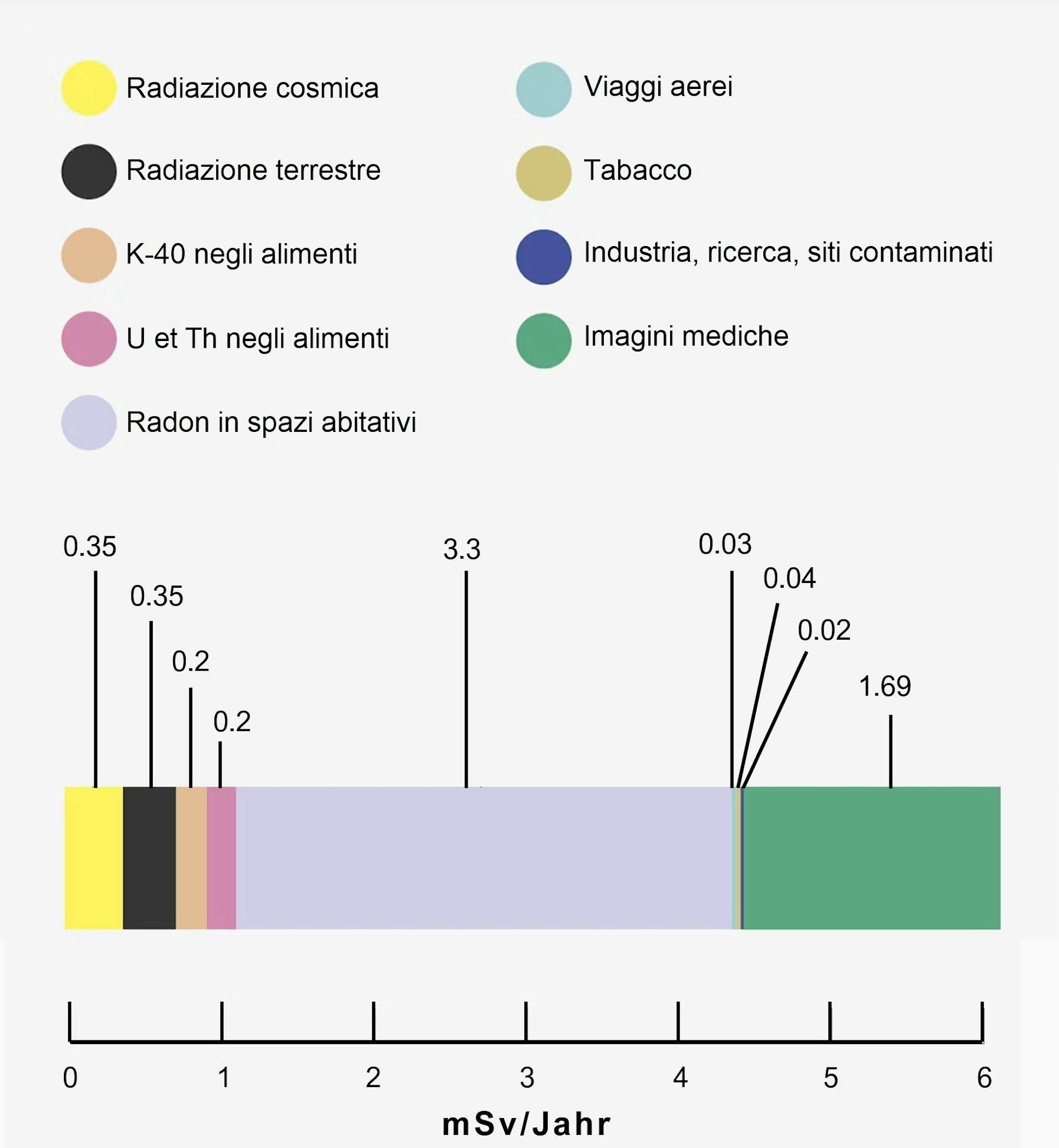 I contributi medi delle sorgenti d’esposizione summenzionate sono illustrati nella figura 1. La dose efficace media ricevuta dalla popolazione svizzera a causa dell’insieme di tutte queste sorgenti d’esposizione si attesta così a circa 6 mSv/anno.