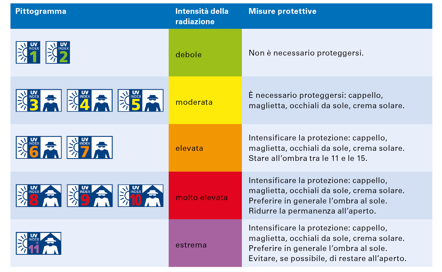 .L’indice UV è rappresentato da un numero e un pittogramma. Il numero indica l’intensità della radiazione UV, mentre il pittogramma a fianco illustra le misure di protezione da adottare in base al valore indicato. Più l’indice UV è elevato, più bisogna proteggersi.