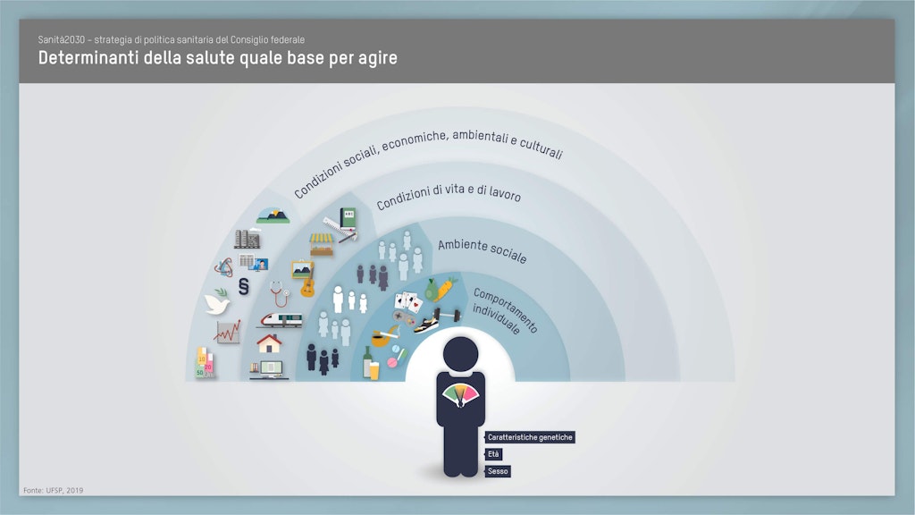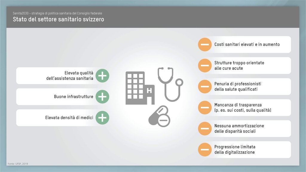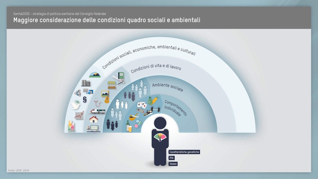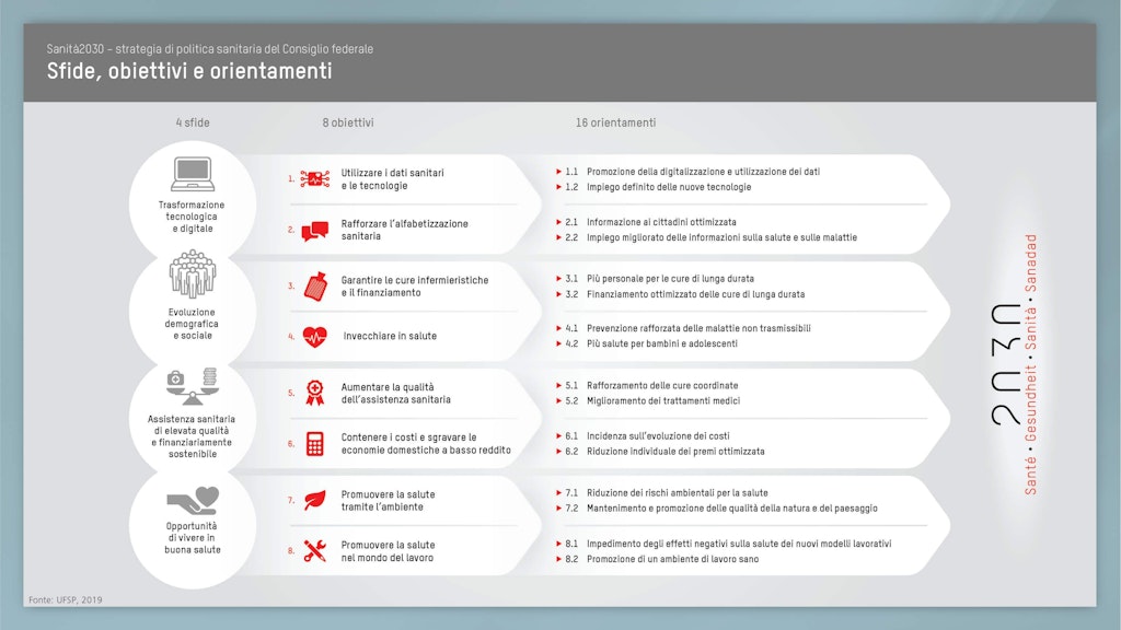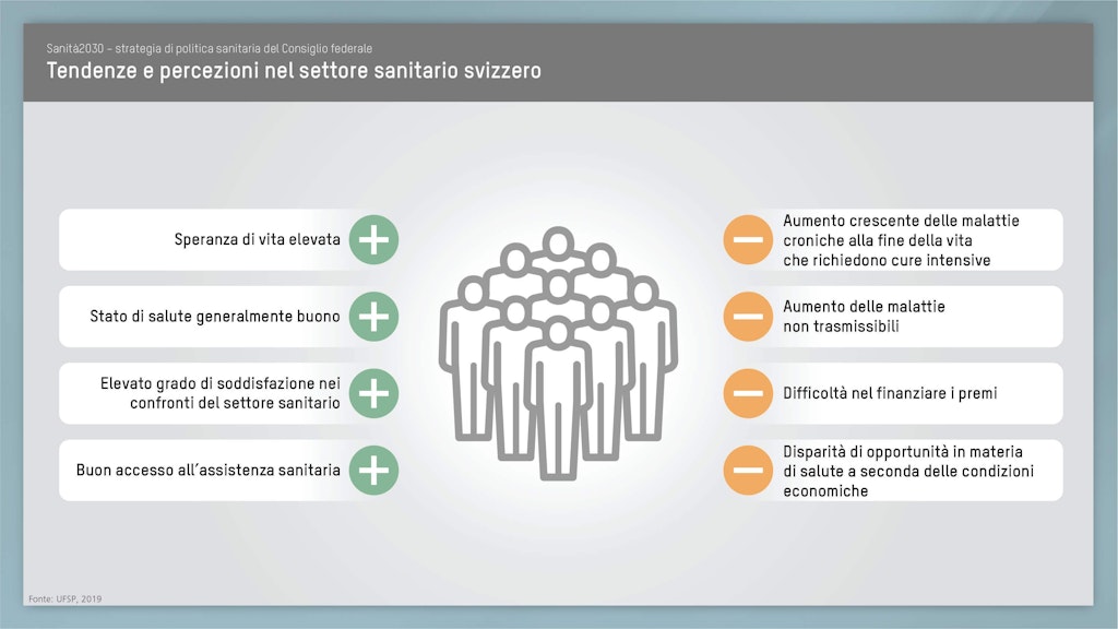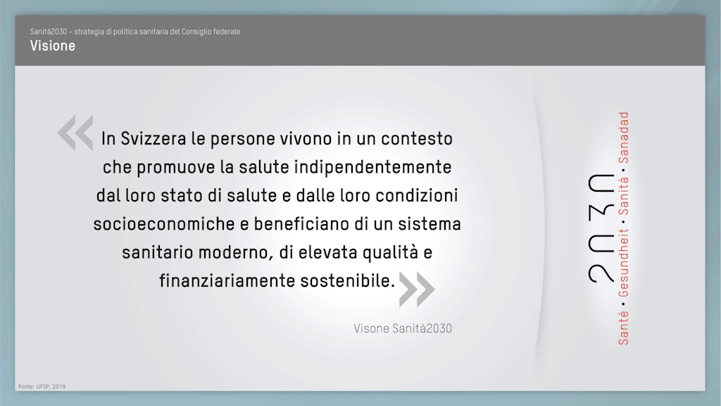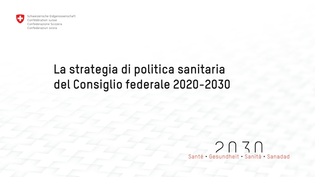 Attraverso la strategia di politica sanitaria 2020–2030, il Consiglio federale intende mettere a punto ulteriori miglioramenti affinché, anche in futuro, in Svizzera tutti possano beneficiare di un sistema sanitario di qualità e finanziariamente sostenibile. Sanità2030 crea il quadro d’azione di politica sanitaria al quale tutti gli attori del sistema sanitario potranno orientarsi.