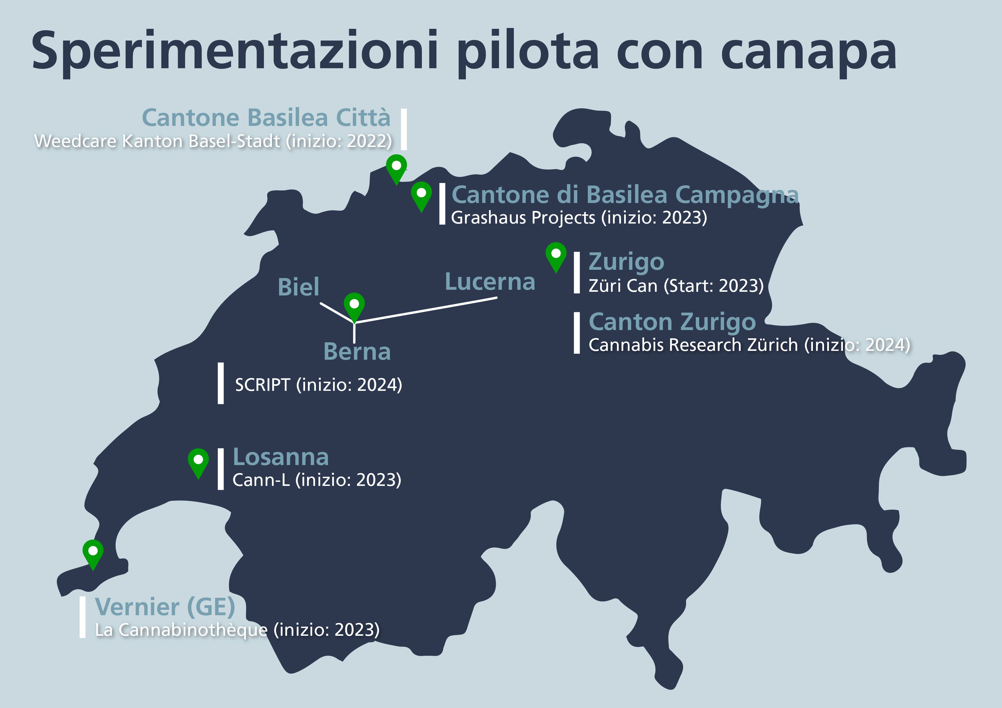 In tutte le maggiori città della Svizzera sono previste sperimentazioni pilota con canapa. I diversi organizzatori prevedono la dispensazione di canapa presso farmacie, cannabis social club, negozi senza scopo di lucro e attraverso altri canali di distribuzione. Le sperimentazioni permettono quindi anche un confronto tra i vari sistemi di distribuzione ed evidenziano i modelli di regolamentazione accettati dai consumatori e dalla popolazione.