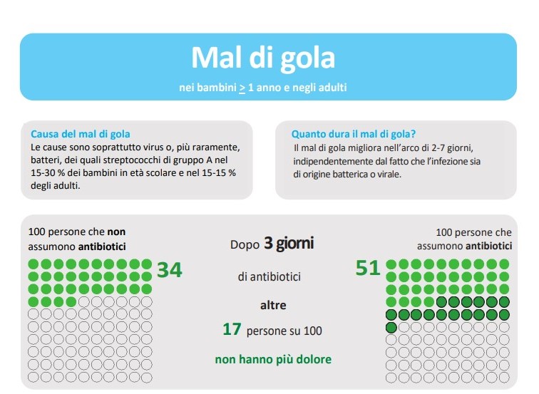 L’Istituto bernese per la medicina di famiglia (BIHAM) ha compilato tre schede informative basate sulle evidenze e supporti decisionali, allo scopo di aiutare i medici di famiglia e i pediatri a prendere una decisione partecipativa insieme ai pazienti per quanto riguarda la somministrazione di antibiotici. Grafici di facile comprensione illustrano i vantaggi e gli svantaggi di una terapia con o senza antibiotici per la tonsillofaringite, l’otite media, le infezioni delle vie urinarie nonché la tosse infettiva e la rinosinusite acute. Ideali come spunti di riflessione e come materiale didattico nei circoli della qualità, sono disponibili sul sito biham.unibe.ch/entscheidhilfen.