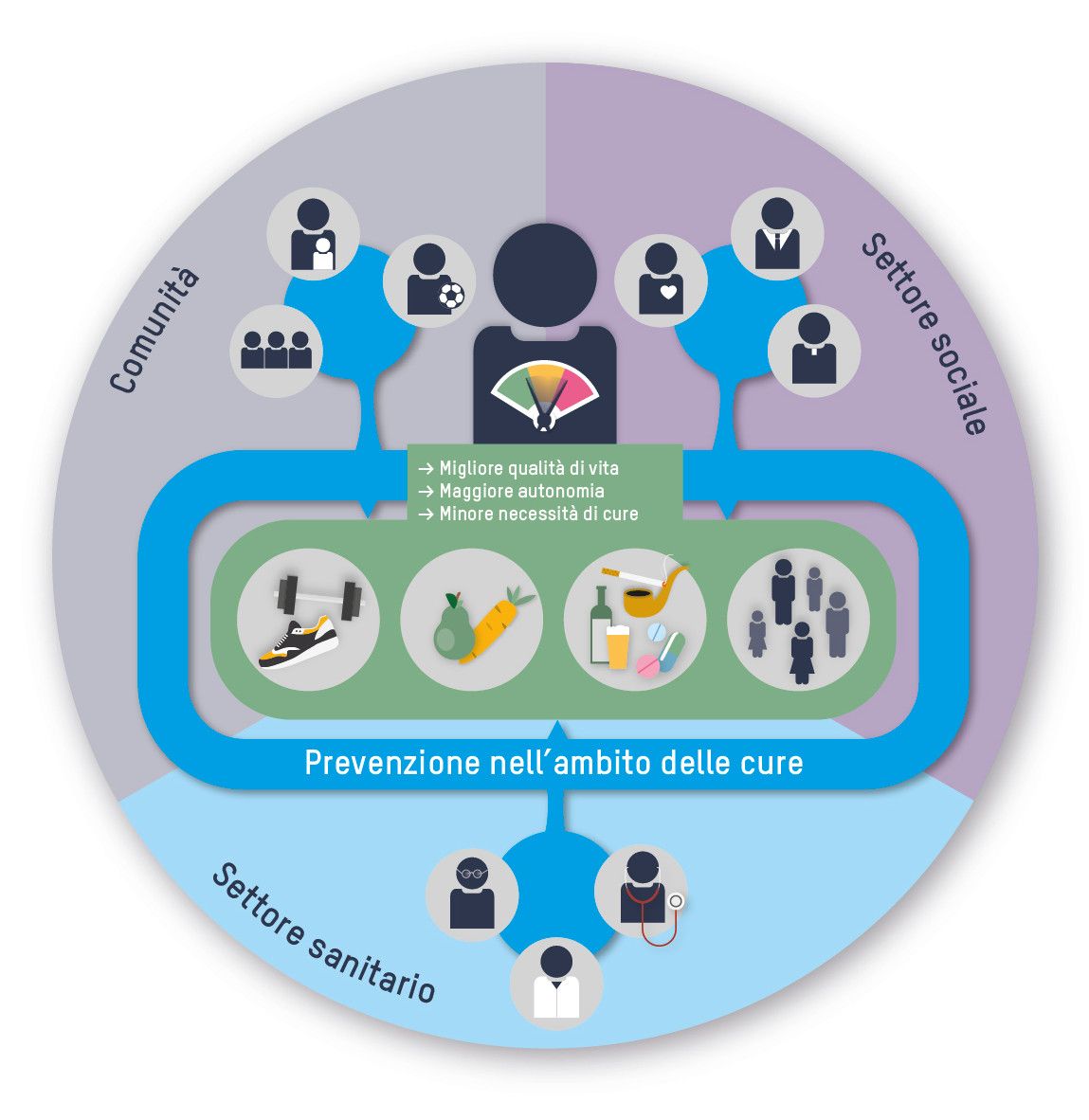 Per migliorare la salute della popolazione sul lungo periodo è necessario rafforzare la prevenzione quale pilastro delle cure. La prevenzione dovrà essere integrata in modo più sistematico nelle attività di trattamento e di consulenza già esistenti e rafforzata la cooperazione con i professionisti.