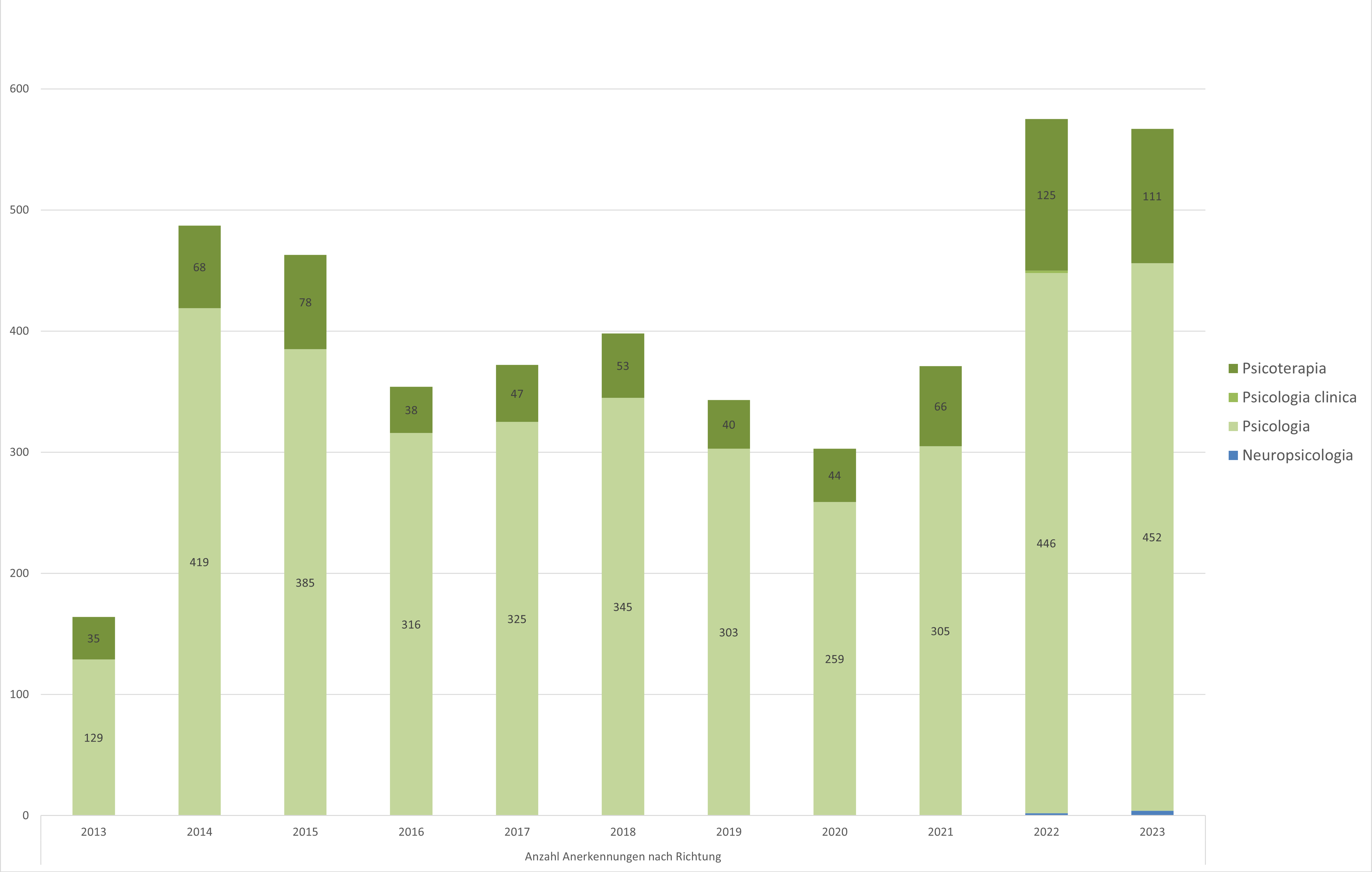 Dal 1° aprile 2013 al 31 dicembre 2023 sono stati riconosciuti complessivamente 3683 diplomi universitari in psicologia e 706 titoli di perfezionamento.