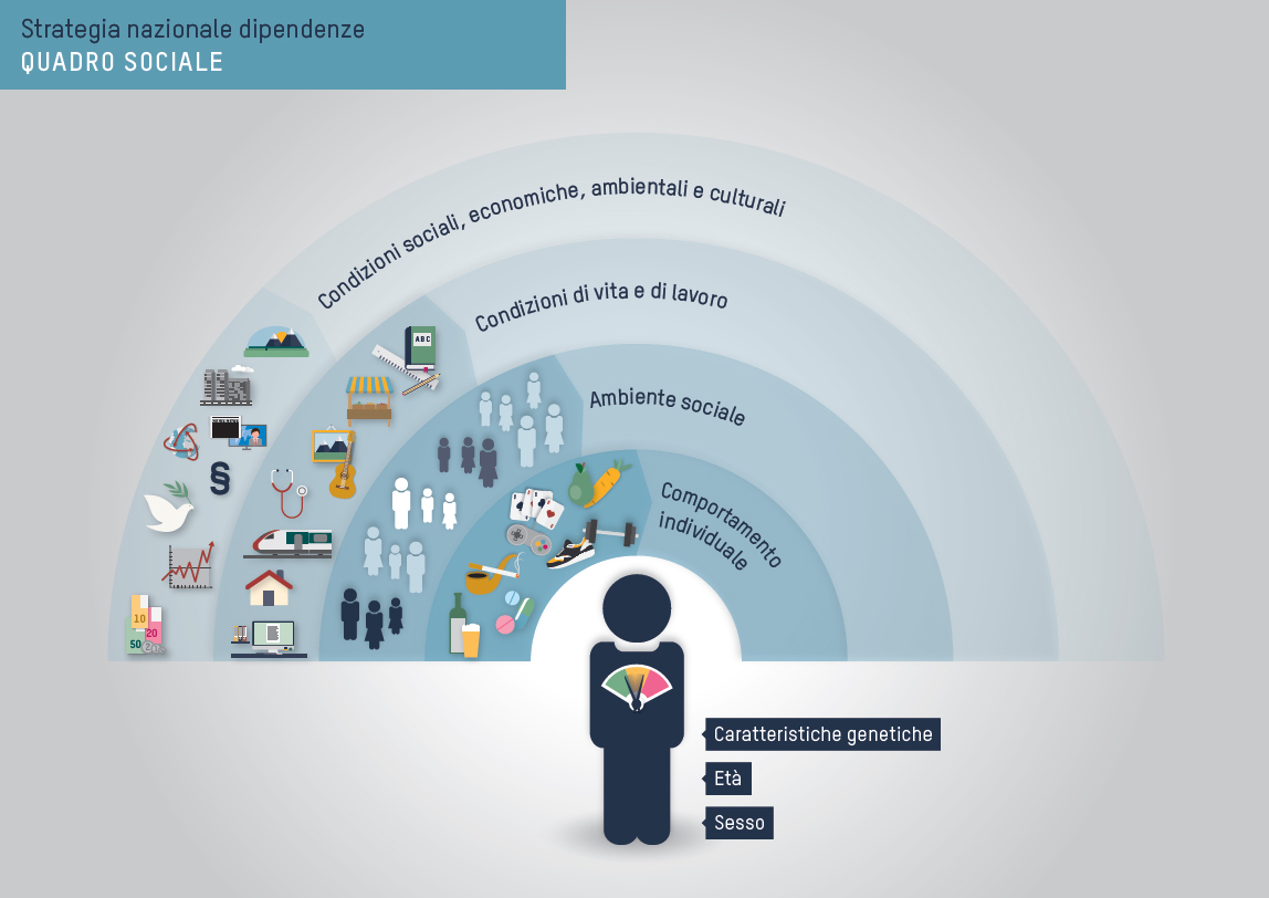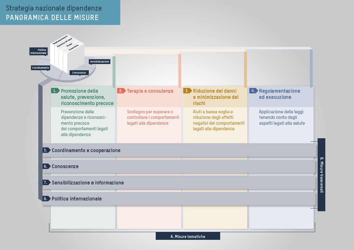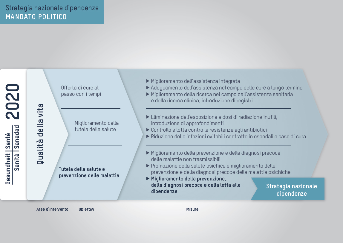 Nell'ambito della strategia Salute2020 del Consiglio federale, l'Ufficio federale della sanità pubblica (UFSP) e i suoi partner hanno sviluppato la Strategia nazionale sulle dipendenze. La strategia è stata adottata dal Consiglio federale 2015. Per la prima volta, crea un quadro di orientamento e di azione completo per gli stakeholder a tutti i livelli federali nel campo delle dipendenze e nelle aree correlate della politica sociale e sanitaria. Serve agli esperti e ai fornitori di servizi come punto di partenza per le loro attività e progetti specifici sulle dipendenze.