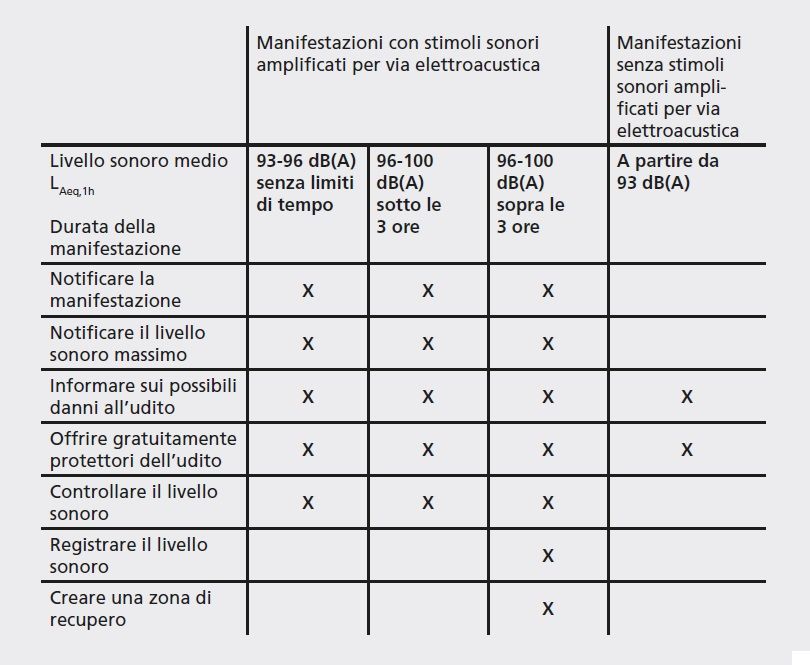 Gli obblighi per gli organizzatori variano in base al livello sonoro medio e alla durata dell’evento: più il volume è alto, più rigorose sono le misure da adottare.